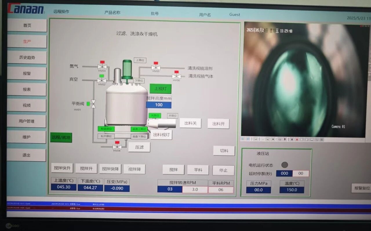 操作人员只需要在中控界面上点击对应的步骤——比如点“加料”,设备就会自动完成整个工作流程。进料阀门与上游结晶罐实现连锁控制,配上双法兰液位计精准监测,料液到达设定位置后系统自动切换、自动关阀。从进料到过滤、洗涤,所有步骤自动完成,不需要人为去判断。